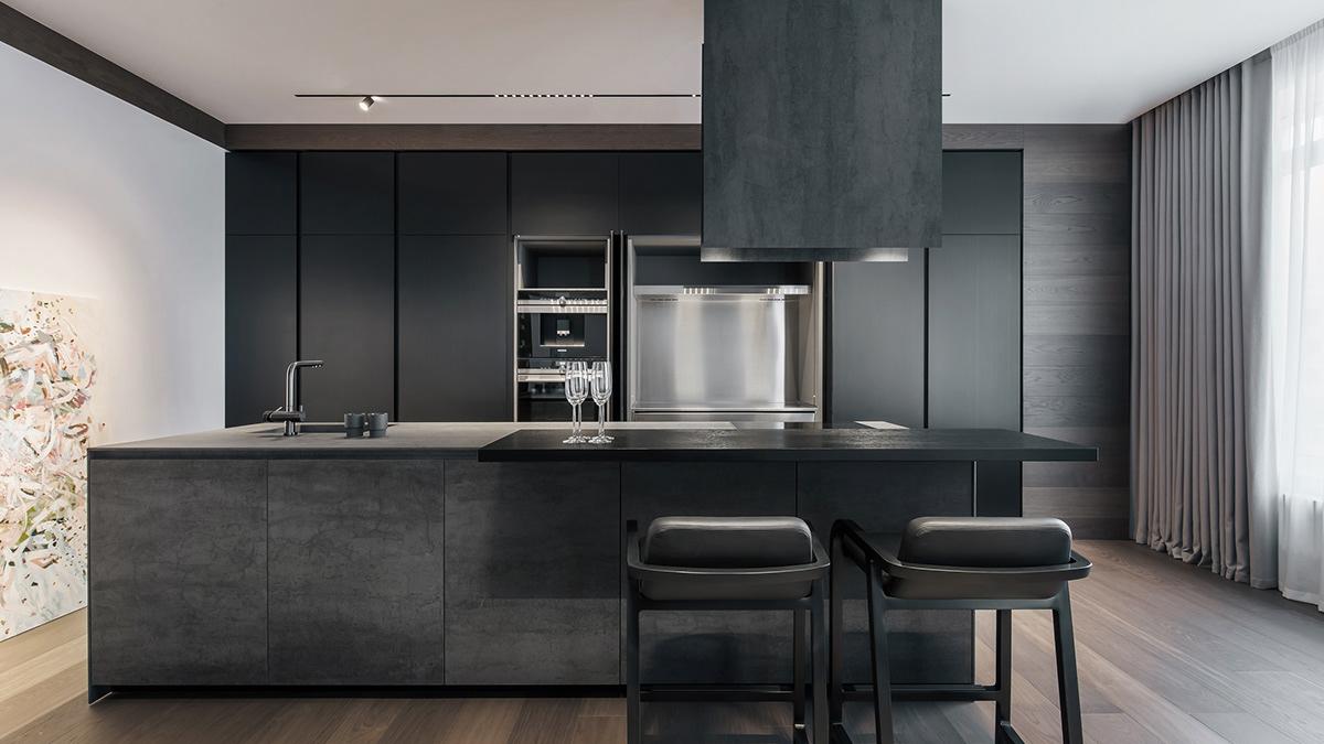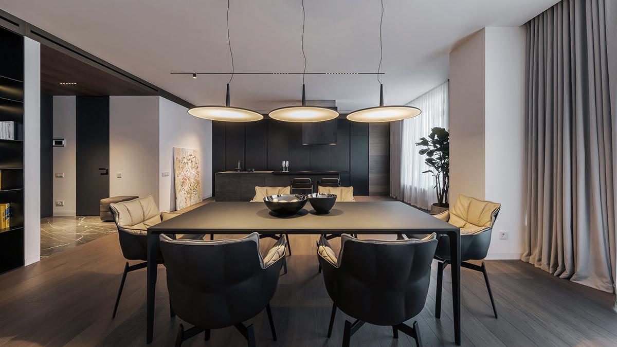 Khu vực công cộng của căn hộ được thiết kế thông qua sự kết hợp ấn tượng giữa phòng khách, phòng ăn và bếp. Khả năng mở của không gian này cho phép ánh sáng tự nhiên từ các cửa sổ từ sàn đến trần chiếu sáng toàn bộ không gian, tạo nên một môi trường sáng sủa và thoáng đãng.